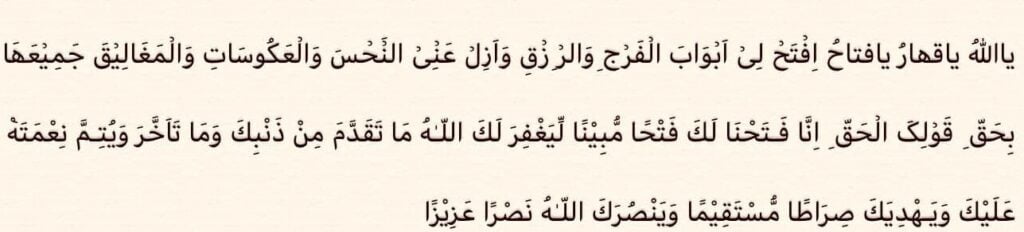 یااللهُ یاقھارُ یافتاحُ اِفࣿتَحࣿ لِیࣿ اَبࣿوَابَ الࣿفَرࣿجِ وَالرࣿ ِزࣿقِ وَاَزِلࣿ عَنِࣿیࣿ النَࣿحࣿسَ وَالࣿعَکُوسَاتِ وَالࣿمَغَالِیࣿقَ جَمِیࣿعَھَا