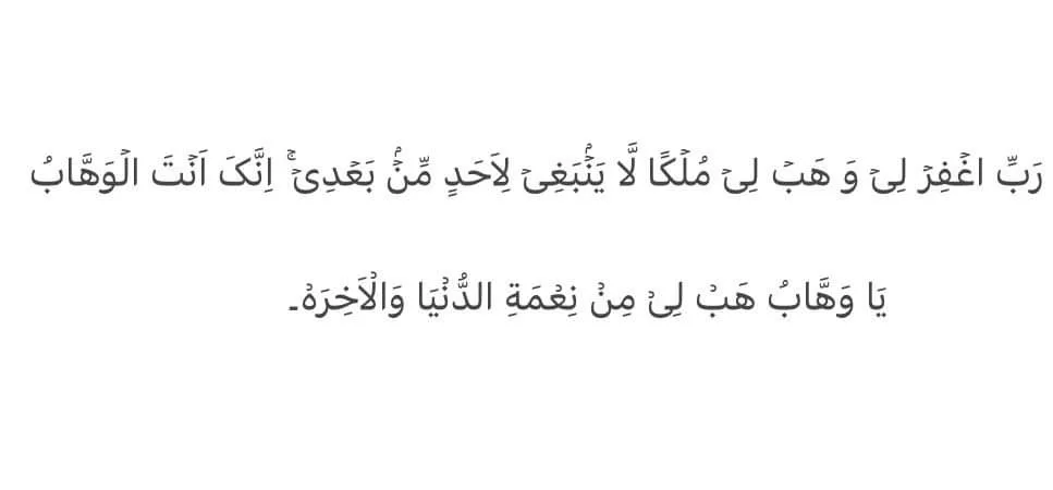 رَبِّ اغۡفِرۡ لِیۡ وَ ھَبۡ لِیۡ مُلۡکًا لَّا یَنۡۢبَغِیۡ لِاَحَدٍ مِّنۡۢ بَعۡدِیۡ ۚ اِنَّکَ اَنۡتَ الۡوَھَّابُ