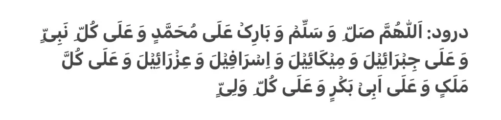 درود: اَللّٰھُمَّ صَلّ ِ وَ سَلِّم وَ بَارِک عَلَی مُحَمَّدٍ وَ عَلَی کُلّ ِ نَبِیّ ٍ وَ عَلَی جِبرَائِیلَ وَ مِیکَائِیلَ وَ اِسرَافِیلَ وَ عِزرَائِیلَ وَ عَلَی کُلَّ مَلَکٍ وَ عَلَی اَبِی بَکرٍ وَ عَلَی کُلّ اوَل